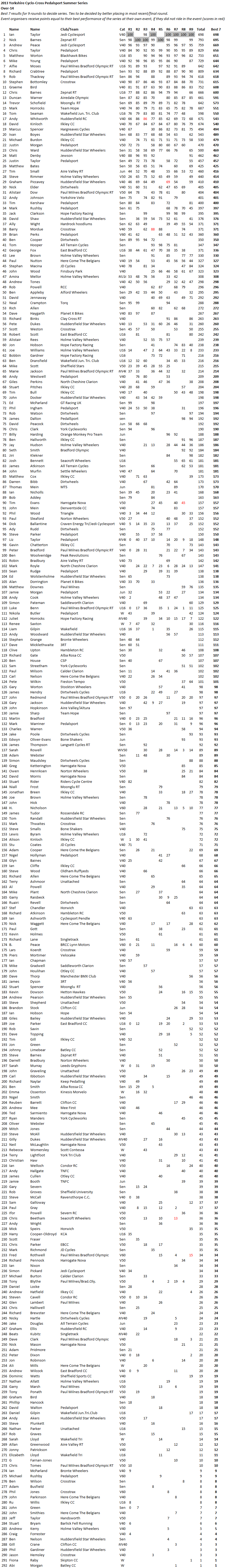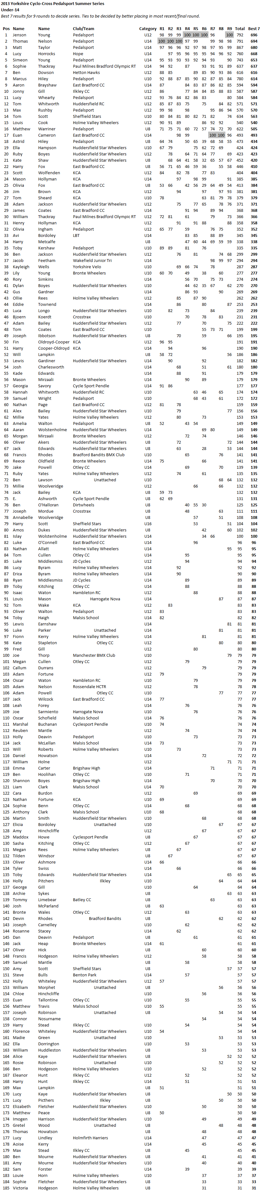 Below are the final series standings for the 2013 Pedalsport YCCA Summer Cyclo-Cross series. There’s also a download of the original spreadsheet. Any amends etc should be emailed to ycca@hotmail.co.uk as soon as possible.