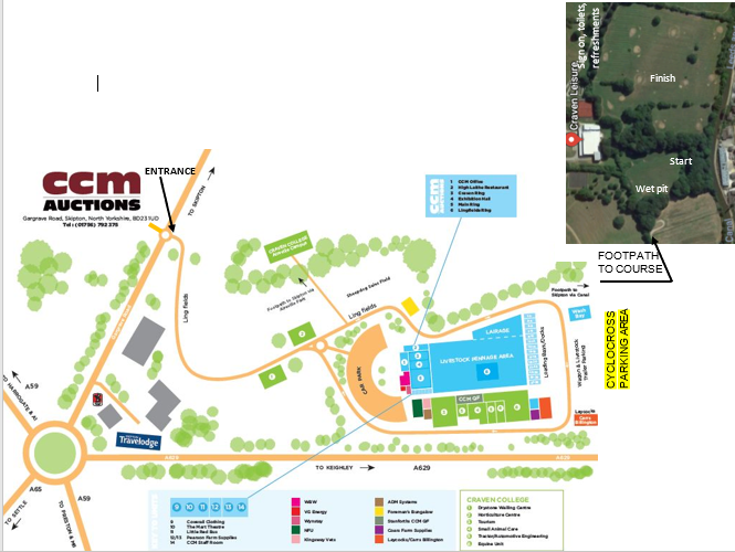 Important Info: Parking for the Skipton CC cyclocross is at Skipton Auction Mart, Gargrave Road, Skipton BD23 1UD. There is footpath access from the auction mart. Because there is another event taking place, if parking on the hard standing at the bottom of the auction mart is full then other parking spaces will be used on the site. There will be parking Marshall’s there to direct. PLEASE NOTE, IT IS IMPORTANT THAT WE DO NOT LEAVE MUD AND DEBRIS IN THE PARKING AREAS SO PLEASE DO NOT CLEAN MUD OFF YOU BIKE IN THE AUCTION MART. When leaving, please note it is one way and do not go back up the way you came but continue on round to the top. Access to the course is along a footpath that takes you to the bottom of the course. Signing on is in the usual place in the main park. There will be a wet pit on the lower part of the course.